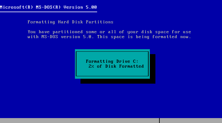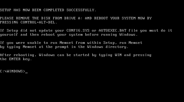 And after a reboot you should now be greeted with the “C:\” prompt. Welcome to DOS 5!