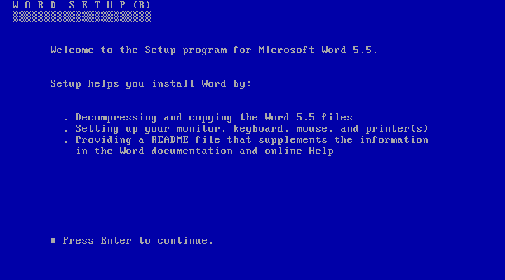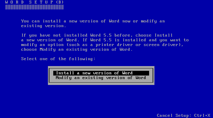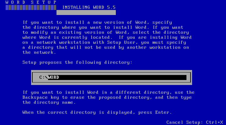 CONGRATS! You can now exit setup, use the “CD” command to change to the word directory, enter “word” and you will be greeted by your new Microsoft Word 5.5 installation!