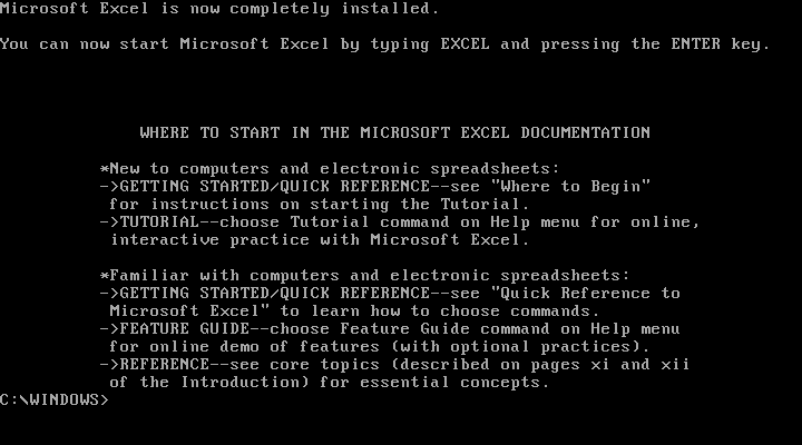 And done! Excel is now in the WINDOWS directory, ready to open. Use the “win” command again to start.