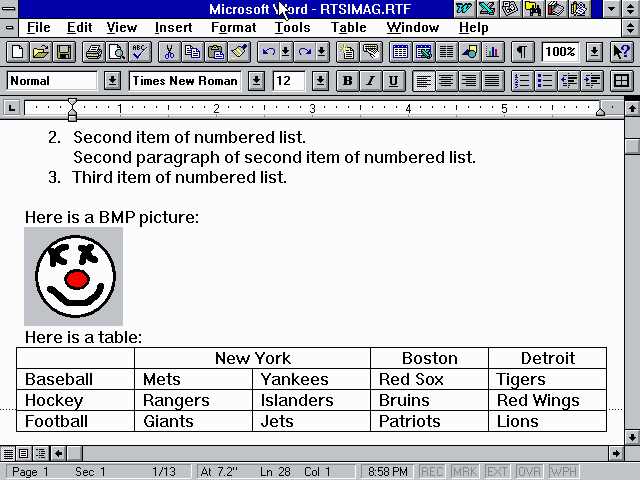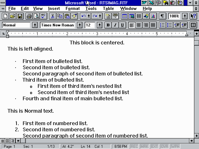 An RTF documents is a bit slower seen Word 6 first converts it to, probably a DOC format. RTF supports all the same features we want to test. So what does Word 6 make of it?